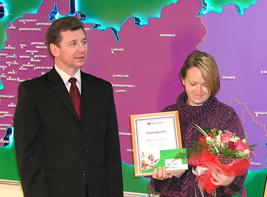 30 января в Центре обслуживания абонентов на ул.Волочаевская, 163 состоялось чествование Миллионного абонента сети МегаФон – Дальний Восток. Им стала Елена Пинигина, жительница ЕАО. Генеральный директор ЗАО «Мобиком – Хабаровск» Юрий Журавель, поздравил Елену с этим знаменательным событием и вручил ценные подарки: телефон Nokia, сертификат на предоставление бесплатных услуг связи в сети МегаФон – Дальний Восток в течение года, и сертификат на получение денежного эквивалента стоимости одного килограмма золота.